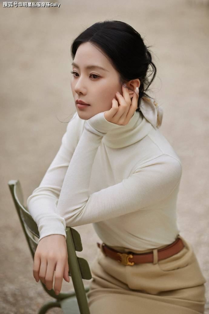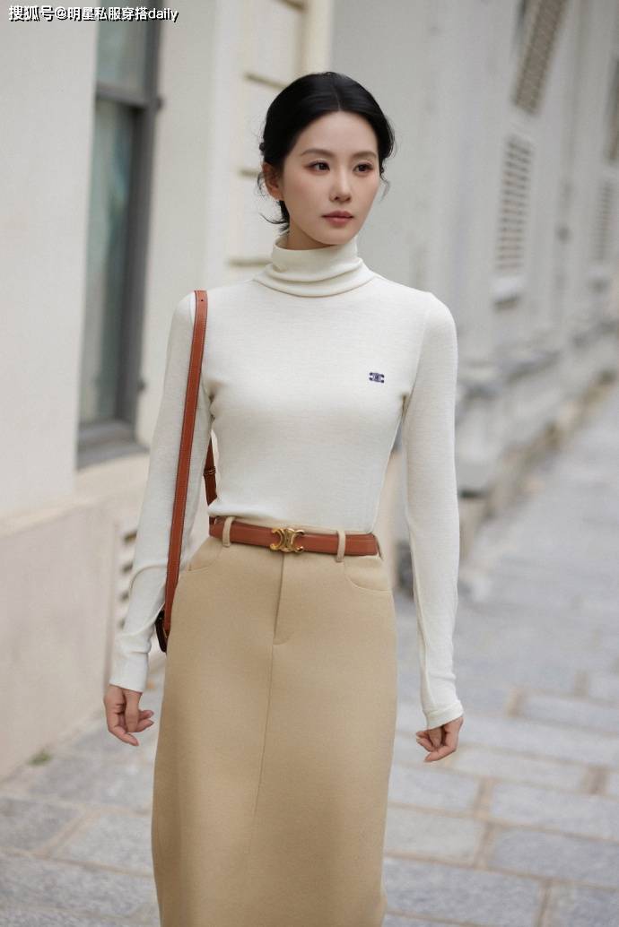 她的这一搭配,既简洁又充满优雅。白色高领的设计既能提亮肤色,又让整体造型增添了高级感。配上清新的发型,这套穿搭更是充满了品质与魅力。