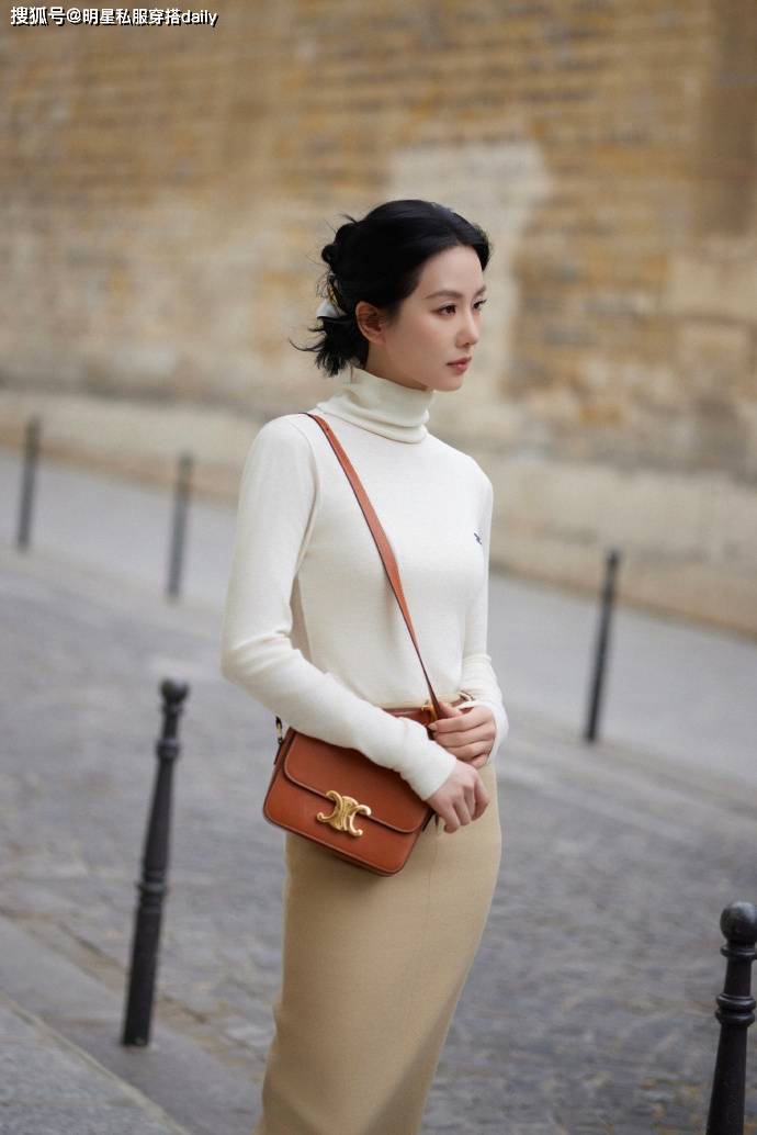 优雅的穿搭往往隐藏在色彩的巧妙运用中。刘诗诗通过这一身造型,将温柔与力量的视觉层次巧妙融合。白色高领修身针织上衣的设计自带复古气息,展现出精致的脖颈线条,让整体造型显得端庄而神秘。修身的剪裁紧贴身体,完美勾勒出她的曼妙身姿,既展现女性的柔美,又不失利落干练。